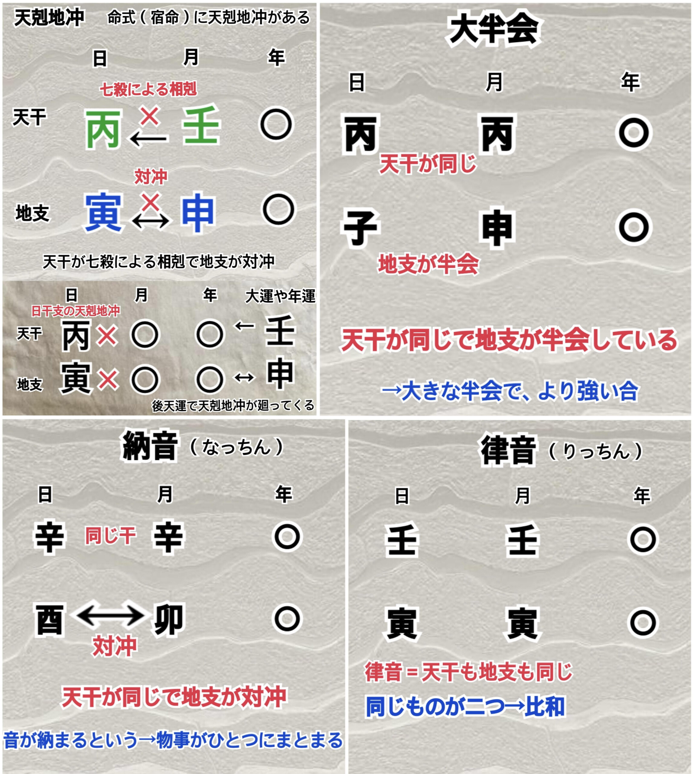 位相法は十干と十二支同士の氣の組み合わせによる法則で、引き合う組み合わせの「合法」と離れる組み合わせの「散法」の大きく2種類に分かれます
