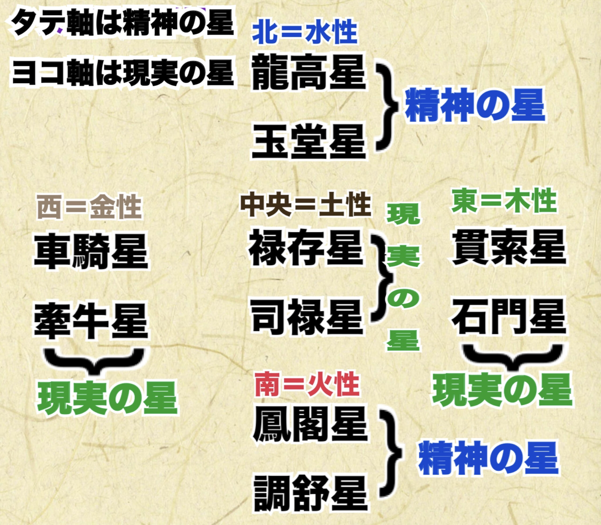 タテ線にある龍高星・玉堂星・鳳閣星・調舒星精神の星