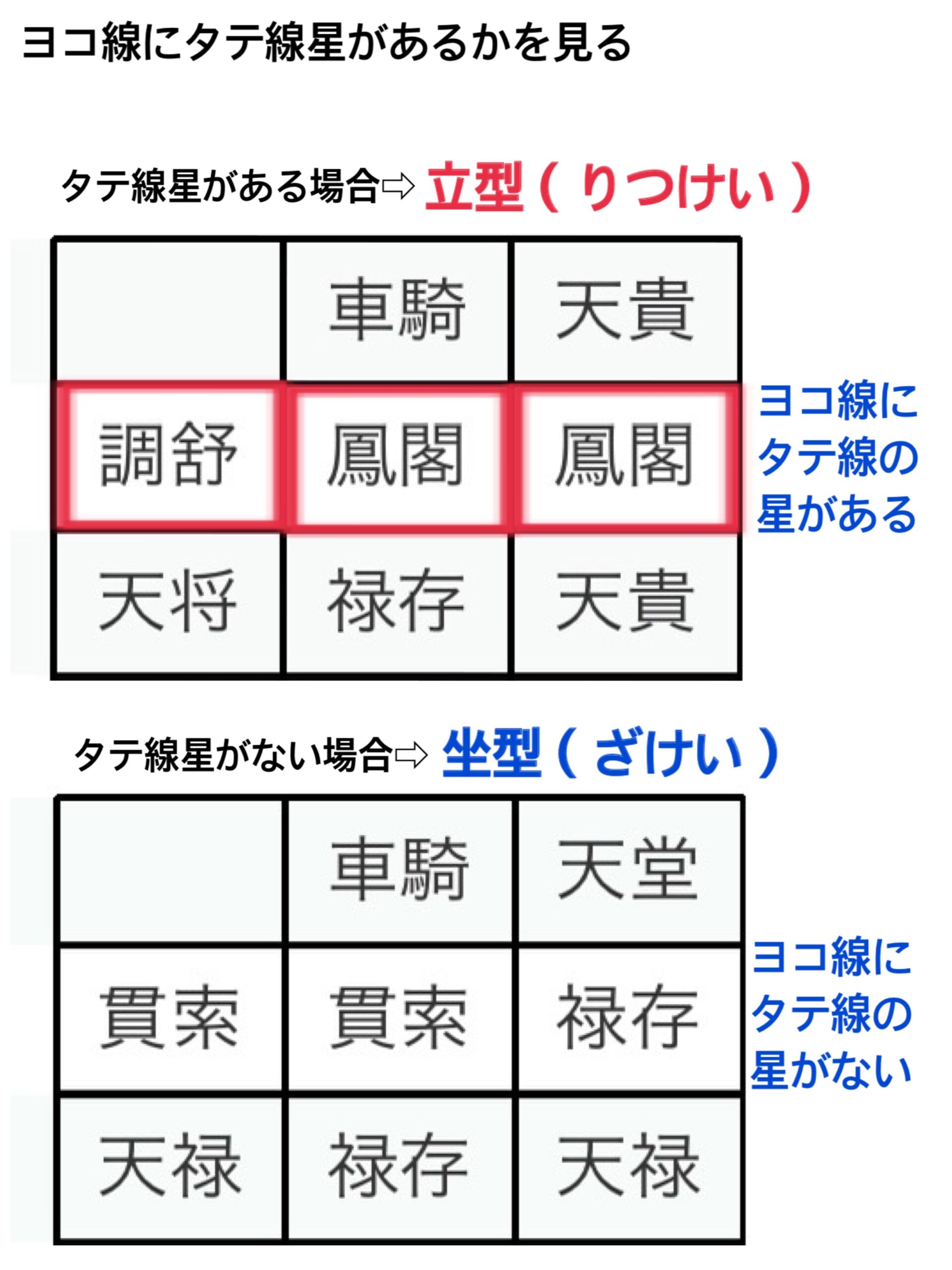 左手・中心・右手に一つでもタテ線星があれば立型、一つもないと坐型となります