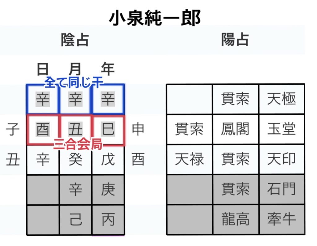 小泉純一郎元総理は天干が全て同じなうえに三合会局が成立していますので、まさに超異次元のパワーも持ち主です