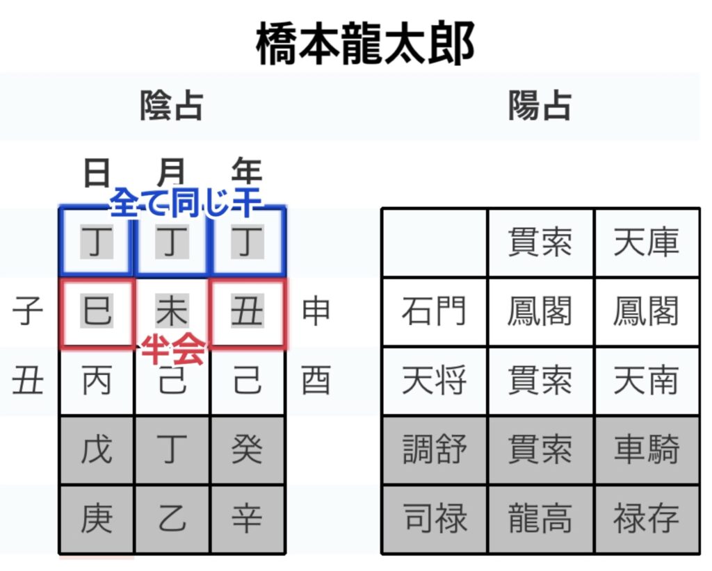 大半会は上記のように『天干が同じで地支が半会』というものです