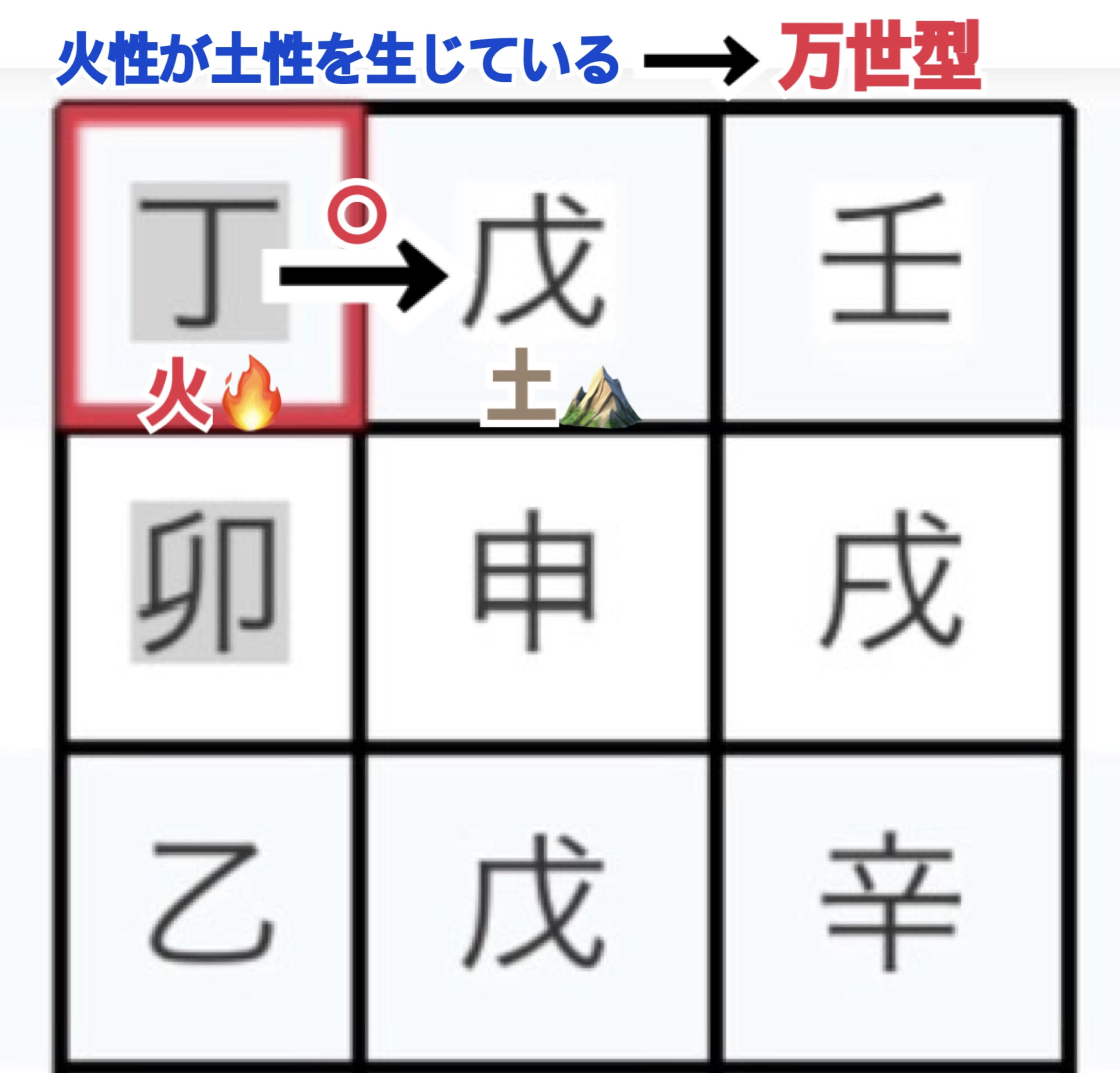 陽占の人体星図を解説している時に陰占を交えて恐縮ですが、石丸さんは日干が火性で月干が土性のため『火〇⇒土』で万世型という型となり、サラリーマンなら出世するタイプです