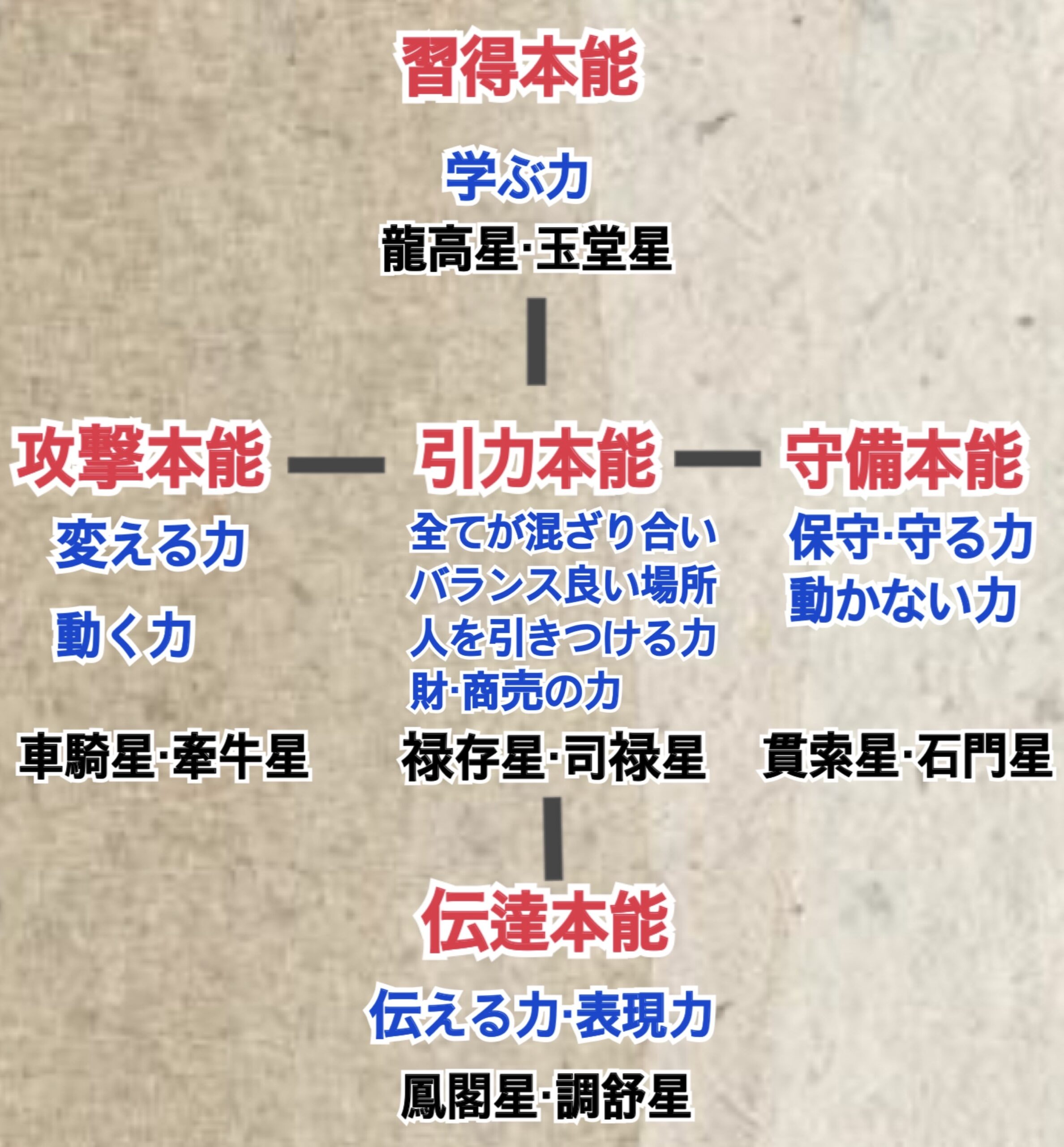 東の星で自己の適性を観ますが、ここではそれぞれどの本能の質をもつのかに重きを置いて考えることです